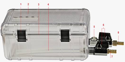 The EM-Tec Save-Storr sample storage container has been developed to store sensitive samples under a dry and inert gas atmosphere. It consists of a robust clear polycarbonate container with seal, gas inlet valve, gas outlet valve and an over-pressure safety valve. The EM-Tec Save-Store container offers ample storage facility with a 1.75 ltr contents and an optional storage shelf.